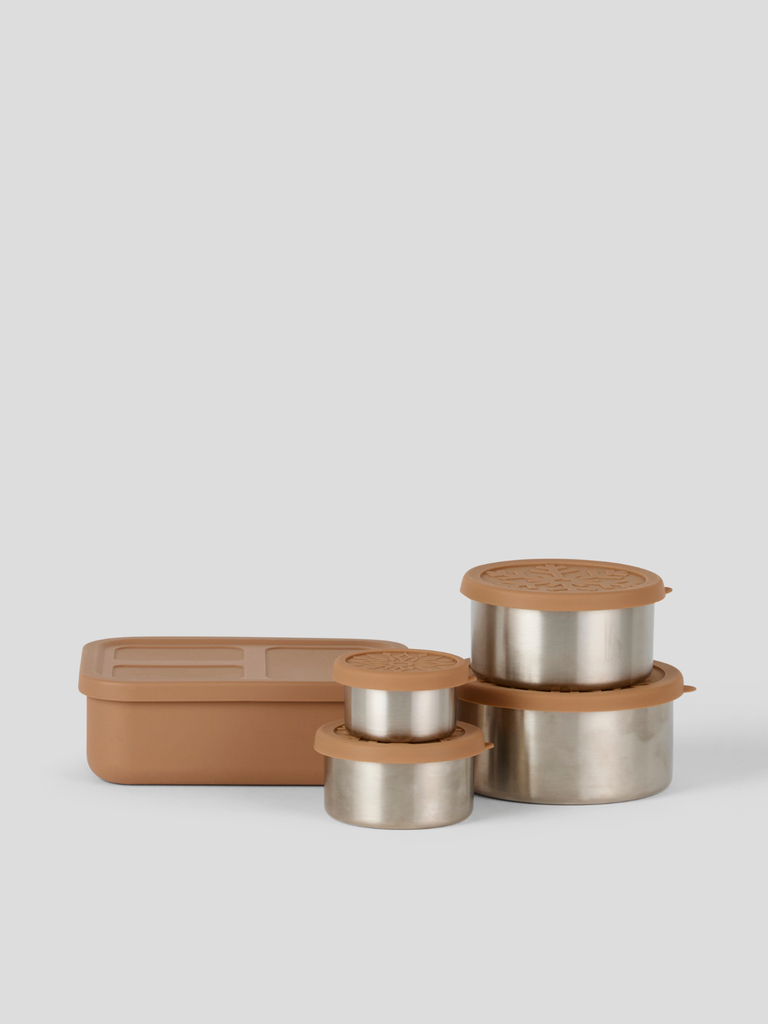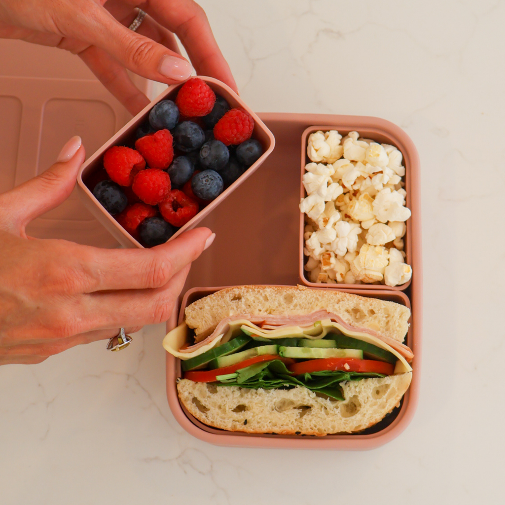 Stay organised on the go with our Silicone Bento Lunch Box Set. This thoughtfully curated bundle includes a 3 Compartment Bento Box [Removable] and 4 Nesting Containers, providing a place for all your mains, sides, and snacks.