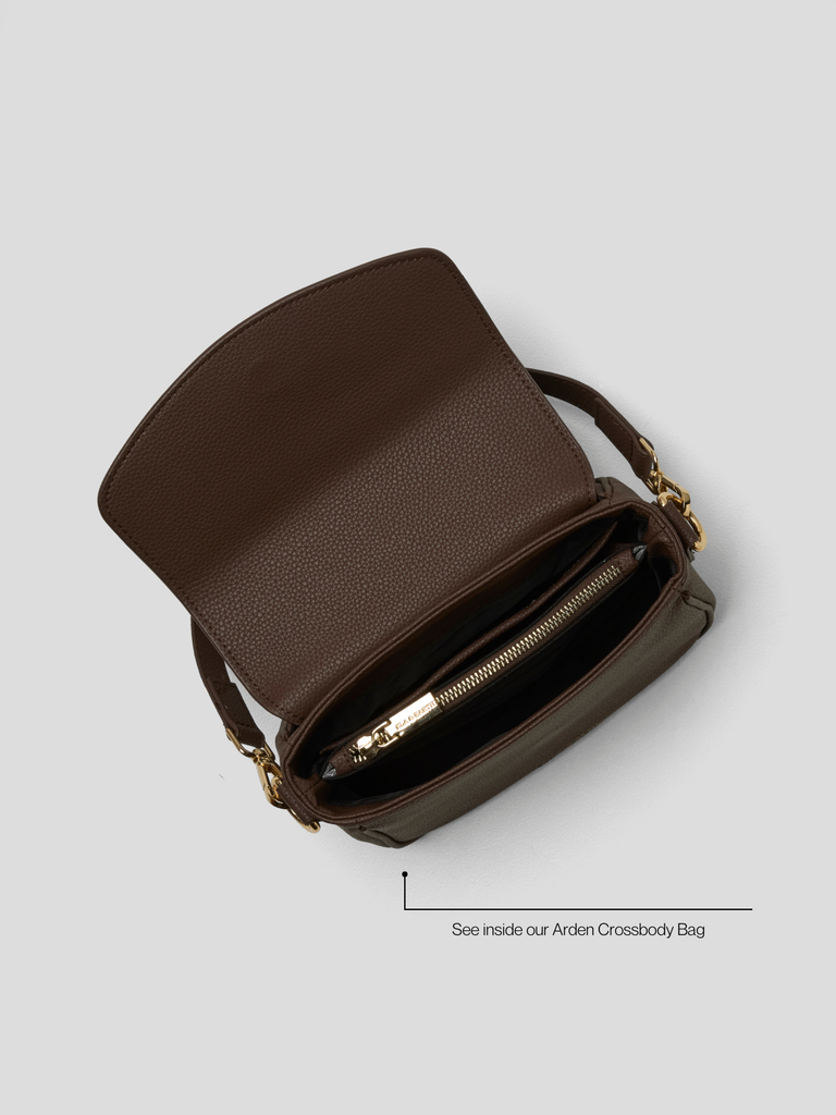 Our Arden Small Crossbody Bag is designed for effortless style and everyday function. Compact yet considered, it’s crafted from vegan pebble leather with gold detailing and features two interchangeable straps, so you can wear it your way.
